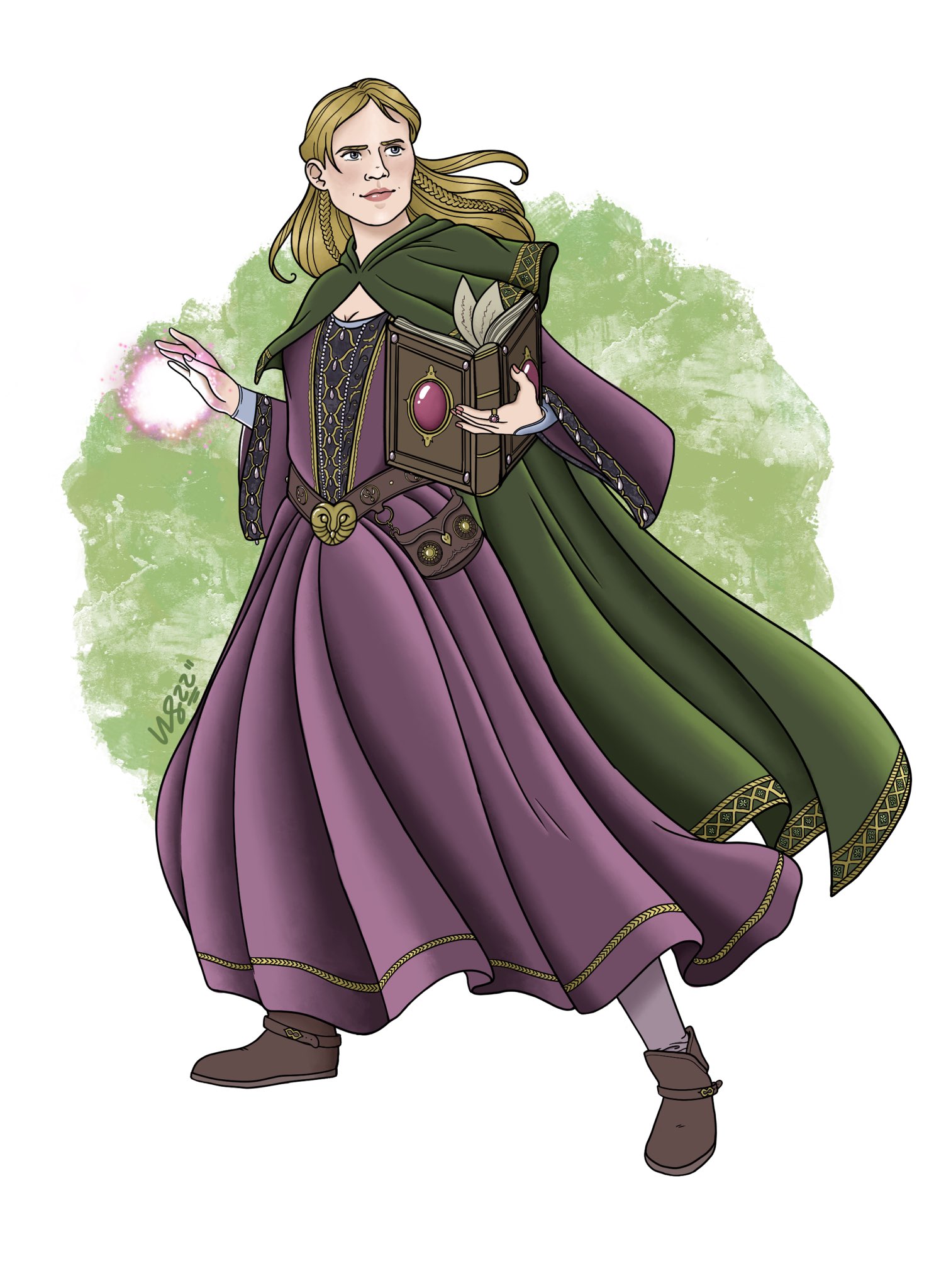 This is a piece I commissioned of my Bonisagus, who was initially trained as a Bjornaer and has an owl heartbeast, but was claimed by a Bonisagus to help in the lab (and maybe reveal her House’s mysteries to her over-curious parens). Her Hermetic name is Striga Fontanae